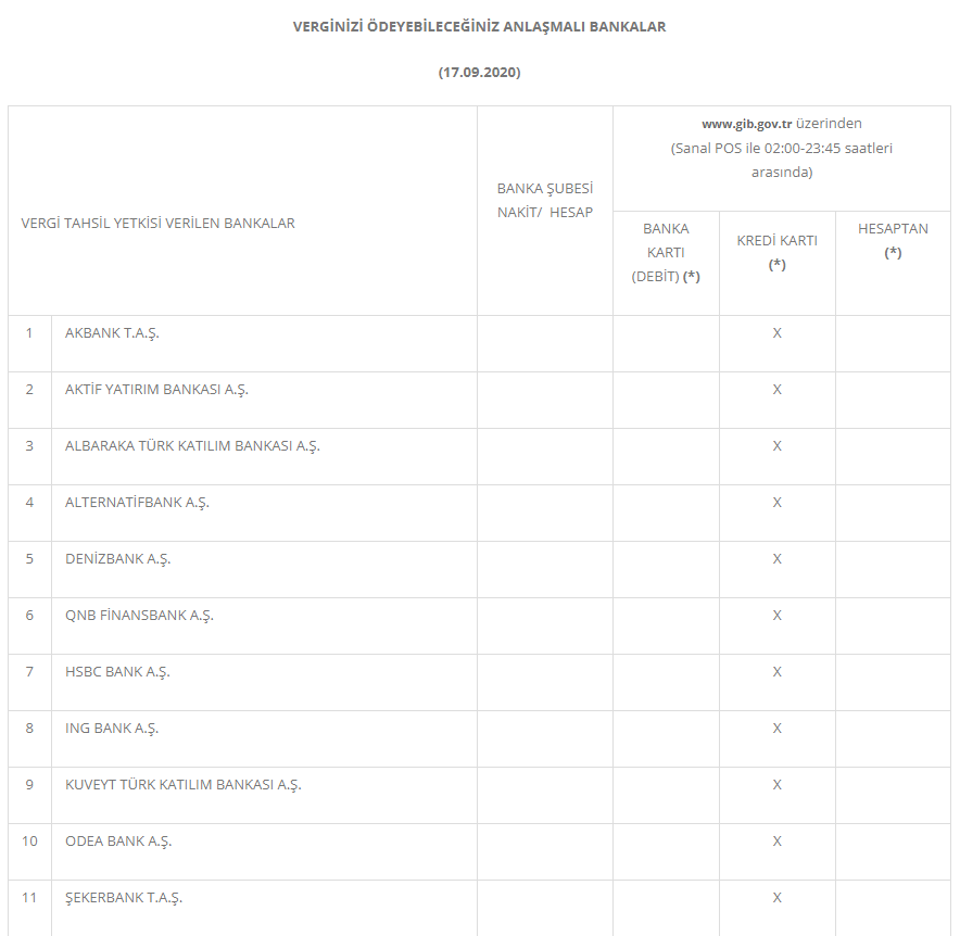 (*) Gişeden tahsilatlarda Bankalara hesap numarası belirtilmesine gerek yoktur.